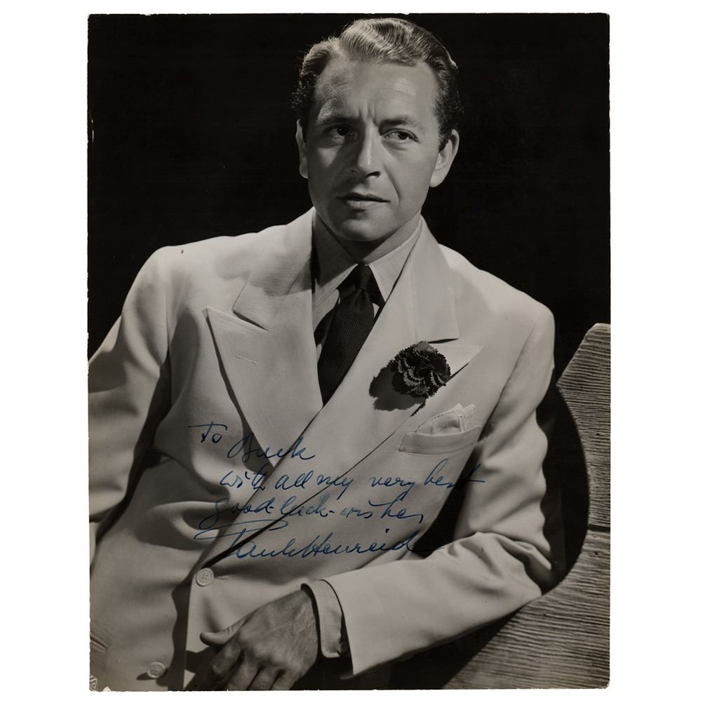 Vintage glossy 7 x 9.25 photo of Henreid in formalwear, signed and inscribed in fountain pen, "To Buck, with all my very best, good-luck=wishes, Paul Henreid." Reverse bears a Schuyler Crail/Warner Bros. credit stamp. In fine condition, with trimmed edges.