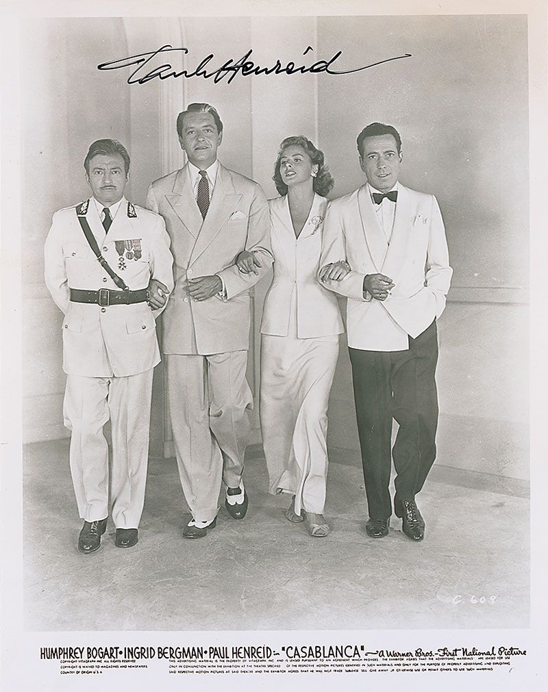 Glossy 8 x 10 promotional photo of the Casablanca cast, signed at the top in black felt tip by Henreid. In fine condition.