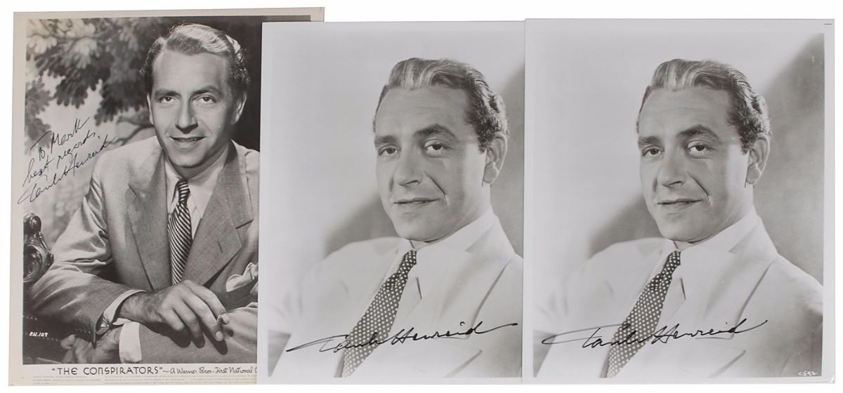 Three glossy photos: an 8 x 10 of Henreid as Vincent Van Der Lyn from the 1944 film The Conspirators, signed and inscribed in black ink, “To Mark, best regards, Paul Henreid”; and two 8 x 9.5 publicity portraits, both signed in black felt tip. In overall very good to fine condition.