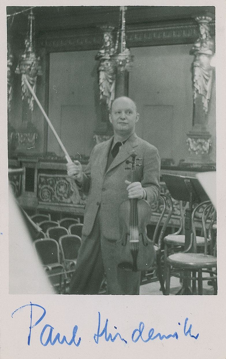 Versatile and prolific German-born composer and performer (1895–1963) whose best-known works include 'Mathis der Maler,' 'Nobilissima Visione,' and 'Das Marienleben.' Matte-finish 3.5 x 5.5 postcard photo of Hindemith in an empty concert hall, signed in the lower border in fountain pen. In fine condition.
