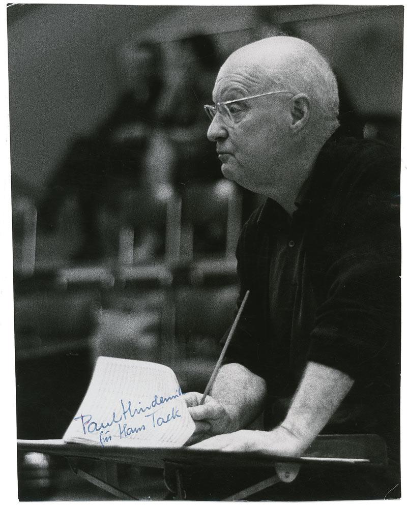 Versatile and prolific German-born composer and performer (1895–1963) whose best-known works include Mathis der Maler, Nobilissima Visione, Das Marienleben, and all manner of orchestral, chamber, and instrumental works. Vintage glossy 6.5 x 8.25 photo of Hindemith at the podium during a rehearsal, signed and inscribed in blue ballpoint. In fine condition, with some scattered light creases and surface marks, and lightly trimmed edges. RRAuction COA.