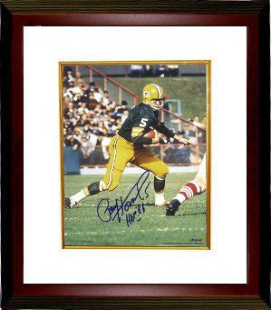 After graduating from Notre Dame with a degree in business, Paul Hornung was the first selection overall in the 1957 NFL Draft. He was taken by the Green Bay Packers, with whom he would go on to win four league championships, including the first ever Super Bowl in January 1967. As a pro, Hornung was one of the most versatile players in the history of the game, playing the halfback position as well as being a field goal kicker for several seasons. Hornung led the league in scoring for three straight seasons from 1959-61. Considered by many to be the best short-yardage runner to ever play the game, Hornung was twice voted the league’s MVP and was chosen as an All-Pro twice and named to the Pro Bowl twice. He is one of only five players to have won both the Heisman Trophy and the NFL's Most Valuable Player Award. Paul Hornung has hand autographed this Green Bay Packers 16X20 Color Photo with HOF86 Inscription. Custom White Mat and Premium Mahogany Color Framed as shown. Certificate of Authenticity from Athlon Sports.