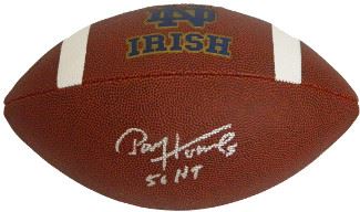 Paul Hornung could do it all. After a college career at Notre Dame in which he excelled at both basketball and football, the 1956 Heisman Trophy winner entered the NFL and quickly made his mark with the Green Bay Packers. Hornung put up big stats as a running back, receiver, kicker and occasional passer over the years and earned numerous awards, including NFL Player of the Year honors in 1960 and 1961 and enshrinement in the Hall of Fame in 1986. Paul Hornung has hand signed this Notre Dame logo Football with 56 HT inscription. PSA Hologram and Certificate of Authenticity is included.