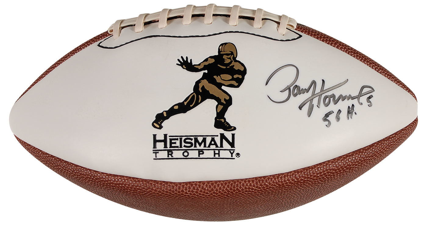 Official Baden commemorative Heisman Trophy football signed in black felt tip on the white panel “Paul Hornung, 5, 56H.” In fine condition.