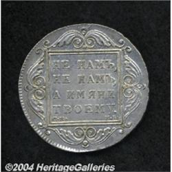 Paul I Rouble 1798CM-Mb, C-101a, lightly toned XF+, very attractive, small planchet crack on the obverse edge at 4 o'clock, barely noticeable.From the Dr. Irving Arenberg Collection. Important notice: Heritage usually auctions material at the rate of 200-250 lots per hour. On some occasions eBay Live bid software or the Internet may not be able to keep up with the pace of the auction. We recommend placing a realistic absentee bid now as insurance to avoid disappointment. Occasionally the auctioneer may eliminate or reject an eBay Live bid, and the auctioneer may also reopen a lot after the close of the eBay live bidding (usually because we missed an audience bid), and may reject your bid even if it shows you as the winning bidder. By bidding via eBay Live, you agree that Heritage may award the lot to another bidder at its sole discretion under the circumstances described above or any other reasonable circumstances. Also please note that all Heritage lots purchased through eBay Live carry a 20% Buyer's Premium. Please make sure you read the Terms and Conditions before you bid.