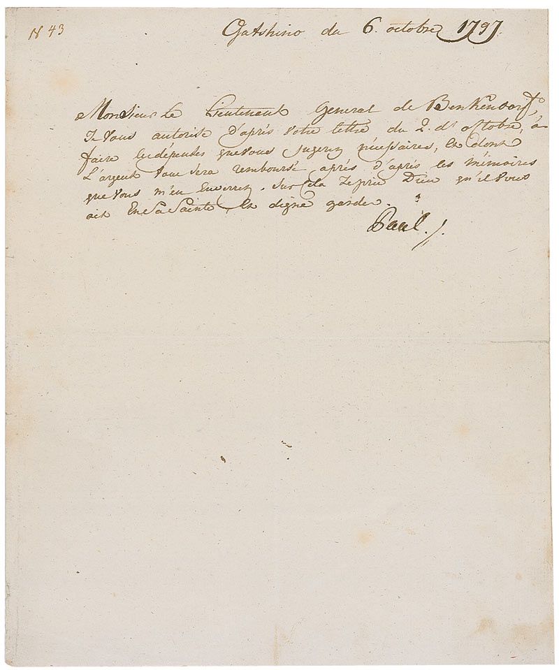 Emperor of Russia (born 1754) from 1796 until his assassination in 1801, the son of Catherine the Great, and a champion of the poorer classes, his sweeping reforms alienated the Russian nobility and were thought to have provided a prime motivation for the conspiracy that led to his brutal death. LS in French, one page, 7.5 x 9, Gatshino, October 6, 1797. To Lieutenant General de Benkendorf authorizing him to effect the necessary expenses that will later be reimbursed. Central horizontal and vertical fold, some scattered light creases and spots of toning, and some paper loss to blank second integral page, otherwise fine condition.