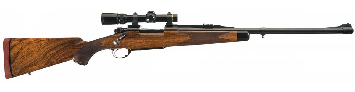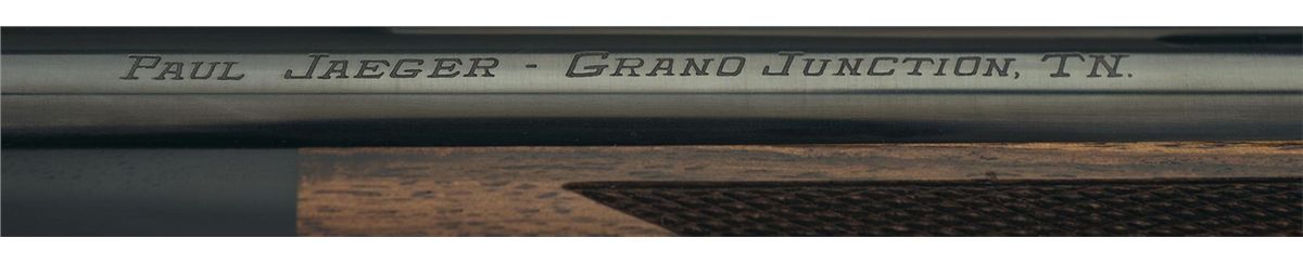 This custom Paul Jaeger rifle is built on the pre-64 Winchester Model 70 rifle receiver. Equipped with a ramp bead blade front sight with provisions for a hood, three leaf rear sight and Leupold 1.5 x 5 scope. The left side of the barrel is marked "PAUL JAEGER GRAND JUNCTION, TN." Jeweled bolt and follower, checkered bolt knob and sling swivel studs. Mounted on a nicely figured and multi-checkered pistol grip stock with ebony forend cap, grip cap with compartment, cheekpiece and solid recoil pad.