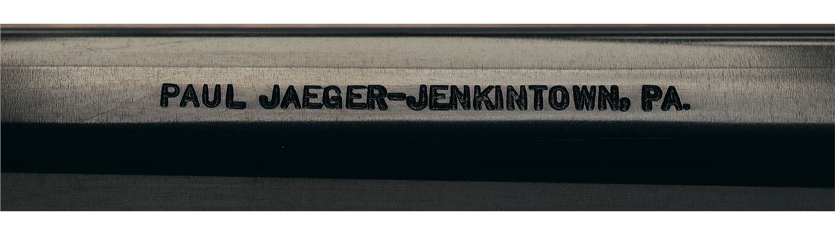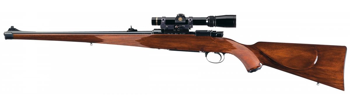 Fixed beaded blade front sight on a long checkered ramp and a Williams adjustable rear sight. The barrel is marked "PAUL JAEGER-JENKINTOWN, PA." on the top and "6.5/55" on the left rear. The top of the receiver is drilled and tapped with filler screws, the right rear is drilled and tapped with filler screws and there is a quick detachable side rail mount with a Leupold Vari-X III 1.5-5x scope with a flip up lens cover. The trigger is marked "JAEGER" and there is a sliding safety on the right side of the top tang. Mounted on a full length walnut pistol grip stock with multi-point checkering, sling studs, steel grip cap, raised cheekpiece and checkered steel buttplate.