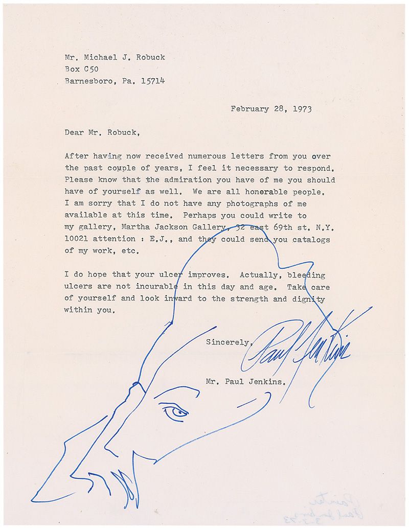 TLS, one page, 8.5 x 11, February 28, 1973. A letter to an admirer. In part: “After having now received numerous letters from you over the past couple years, I feel it necessary to respond. Please know that the admiration you have of me you should have of yourself as well. We are all honorable people. I am sorry that I do not have any photographs of me available at this time…I do hope that your ulcer improves. Actually, bleeding ulcers are not incurable in this day and age. Take care of yourself and look inward to the strength and dignity within you.” Along with his signature, Jenkins has added a small self-portrait sketch. In fine condition, with a few light creases and a fold passing through the signature. Accompanied by original mailing envelope, filled out in Jenkins’ hand, including another signature in the return address area.