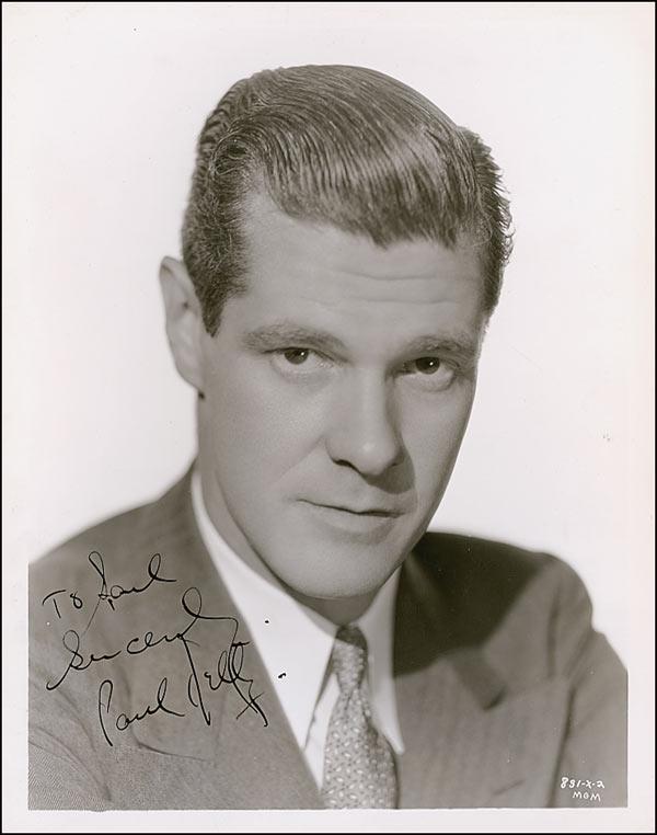 Vintage glossy 8 x 10 MGM publicity photo, signed and inscribed in-person in fountain pen “To Saul, Sincerely, Paul Kelly.” Reverse of photo bears collector’s stamp date of May 7, 1936, the date the signature was acquired. Printed information on reverse states Kelly is “as he appears in a forthcoming MGM picture.” Scattered creases, surface marks, and impressions, otherwise fine condition. The Saul Goodman collection.
