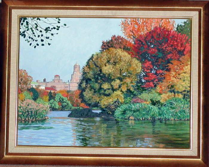 A typical Fall scene in Central Park by the NY born creative realist who specializes in New York scenes. 18”x24” oil on board, signed by the artist. Nicely framed as illustrated. Domestic shipping and packing-$175, International depends upon location.