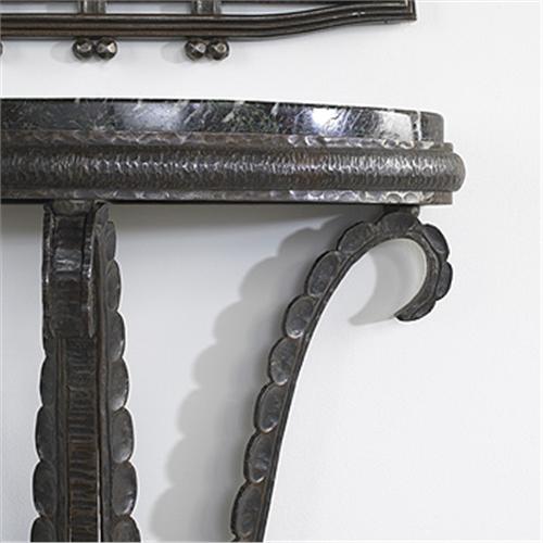 Paul Kiss mirror and console France, c. 1930 wrought iron, marble, silvered glass 27.5"w x 7.5"d x 36.75"h Paul Kiss was a Hungarian designer operating primarily in Paris and worked under preeminent metalworkers Edgar Brandt and Raymond Subes. His intricate metalwork incorporated traditional Art Deco elements in clean, precise designs.