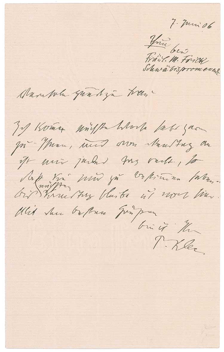Important Swiss-German artist (1879–1940) whose works incorporate a number of the most influential movements of the day, including Surrealism, Expressionism, and Cubism. ALS in German, signed “P. Klee,” one lightly-lined page, 4.5 x 7.25, June 7, 1906. Klee writes to collector Marie von Sinner in Berlin. In part: “I will be glad to come to you and see you next week, and from Thursday on every day should be fine, so you just have to say when. I will be staying here until Saturday.” In fine condition, with usual mailing folds and mild toning. Pre-certified PSA/DNA and RRAuction COA.