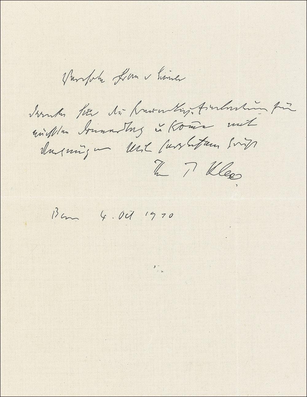 Important Swiss-German artist (1879–1940) whose works incorporate a number of the most influential movements of the day, including Surrealism, Expressionism, and Cubism. ALS in German, signed “P. Klee,” one page, 5.75 x 7.25, October 4, 1910. Letter to the collector of Klee's art, Marie von Sinner in Bern-Engried. In part: “Thank you for your invitation for next Thursday I shall come with pleasure.” In fine condition, with intersecting folds, one through a single letter of signature, and a few light wrinkles. RRAuction COA.