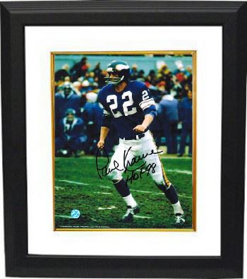 Paul Krause played defensive back for the Minnesota Vikings. He set the NFL record for interceptions with 81, which he picked off from 45 different quarterbacks, and was inducted into the Pro Football Hall of Fame in 1998. Paul Krause hand autographed Minnesota Vikings 8x10 Photo with HOF 98 inscription. Certificate of Authenticity from Athlon Sports Collectibles. Custom White Mat and Premium Black Color Framed as shown.