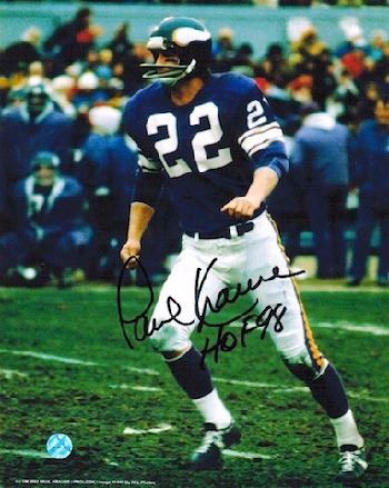 Paul Krause played defensive back for the Minnesota Vikings. He set the NFL record for interceptions with 81, which he picked off from 45 different quarterbacks, and was inducted into the Pro Football Hall of Fame in 1998. Paul Krause hand autographed Minnesota Vikings 8x10 Photo with HOF 98 inscription. Certificate of Authenticity from Athlon Sports Collectibles.