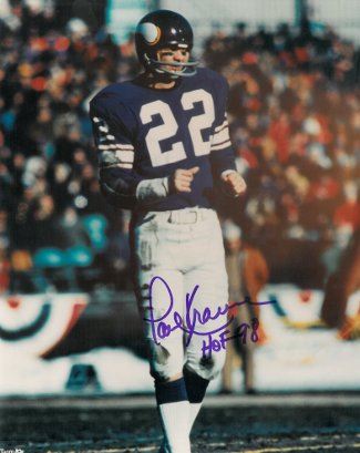 Paul Krause played defensive back for the Minnesota Vikings. He set the NFL record for interceptions with 81, which he picked off from 45 different quarterbacks, and was inducted into the Pro Football Hall of Fame in 1998. Paul Krause hand autographed Minnesota Vikings 8x10 Photo with HOF 98 inscription. Certificate of Authenticity from Athlon Sports.