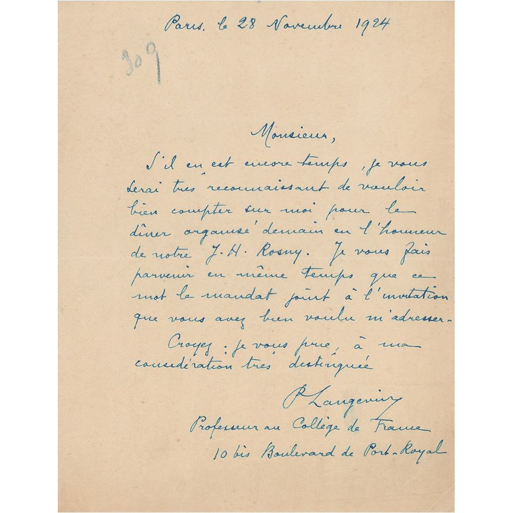 ALS in French, signed “P. Langevin, Professeur au College de France,” one page, 5.5 x 7, November 28, 1924. Untranslated. In fine condition.