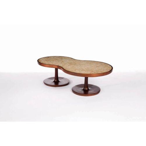 Artist Name: Paul Laszlo<BR>Manufacturer: Custom designed<BR>Description: Coffee table<BR>Circa: designed circa 1954<BR>Medium: Teakwood finish with inlaid Capis shell top<BR>Signature: <BR>Measurements: 14"h x 46"l x 27"w<BR>Edition: <BR>Notes: A similar
