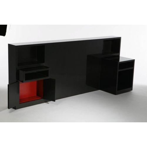 Artist Name: Paul Laszlo<BR>Manufacturer: Custom<BR>Description: Headboard with separate end table<BR>Circa: designed circa 1954<BR>Medium: <BR>Signature: <BR>Measurements: Headboard 34.5"h x 81.75"l x 14"d; Side table 21.5"h x 16.5" x 20"<BR>Edition: <BR