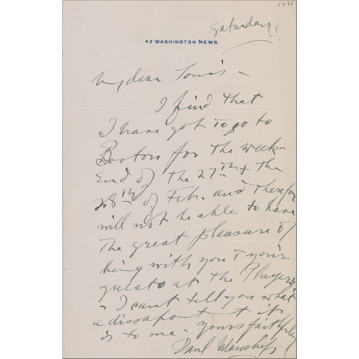 Sculptor of the Prometheus fountain located in Rockefeller Center (1885–1966). ALS, one page, 5.5 x 8.5, Washington Mews letterhead, no date. In a letter of regretful cancellation, Manship writes, in full: “I find that I have got to go to Boston for the Weekend of the 27th & the 28th of Feb. and therefore will not be able to have the great pleasure of being with you & your guests at the Players. I can’t tell you what a disappointment it is to me.” In fine condition, with a small numeric pencil notation in another hand at the top right corner. Accompanied by original mailing envelope, addressed in Manship’s hand.