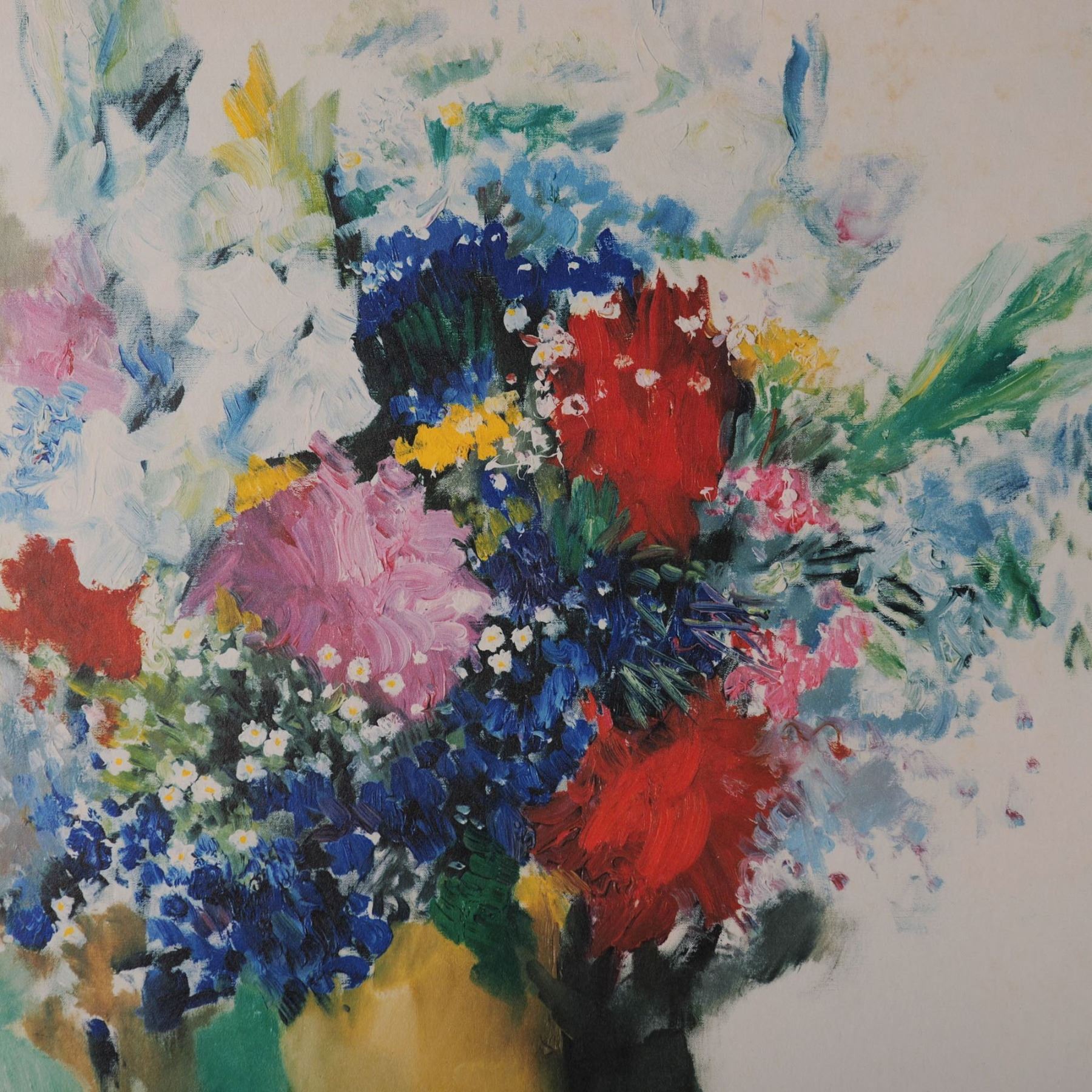 Still life Flowers on White Background is a color lithograph on paper board after Austrian-German artist Paul-Matthias Padua's original oil on canvas. Signature and date in plate on lower right side: Padua 62. Published by Catalda Fine Arts, Inc. New York. Housed in a cream color and lightly gilded textured frame. Sight size: 19"L x 22.75"H. Frame dimensions: 26.75"L x 30.50"H x 1.50"W.