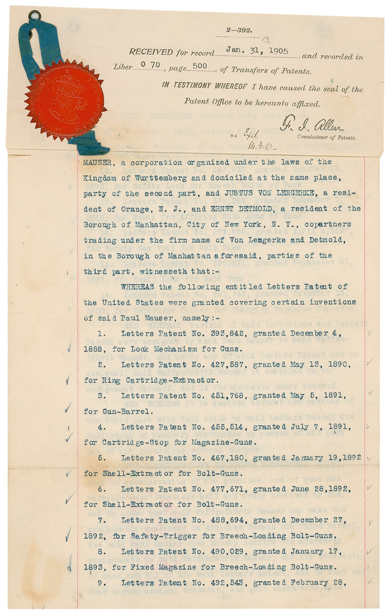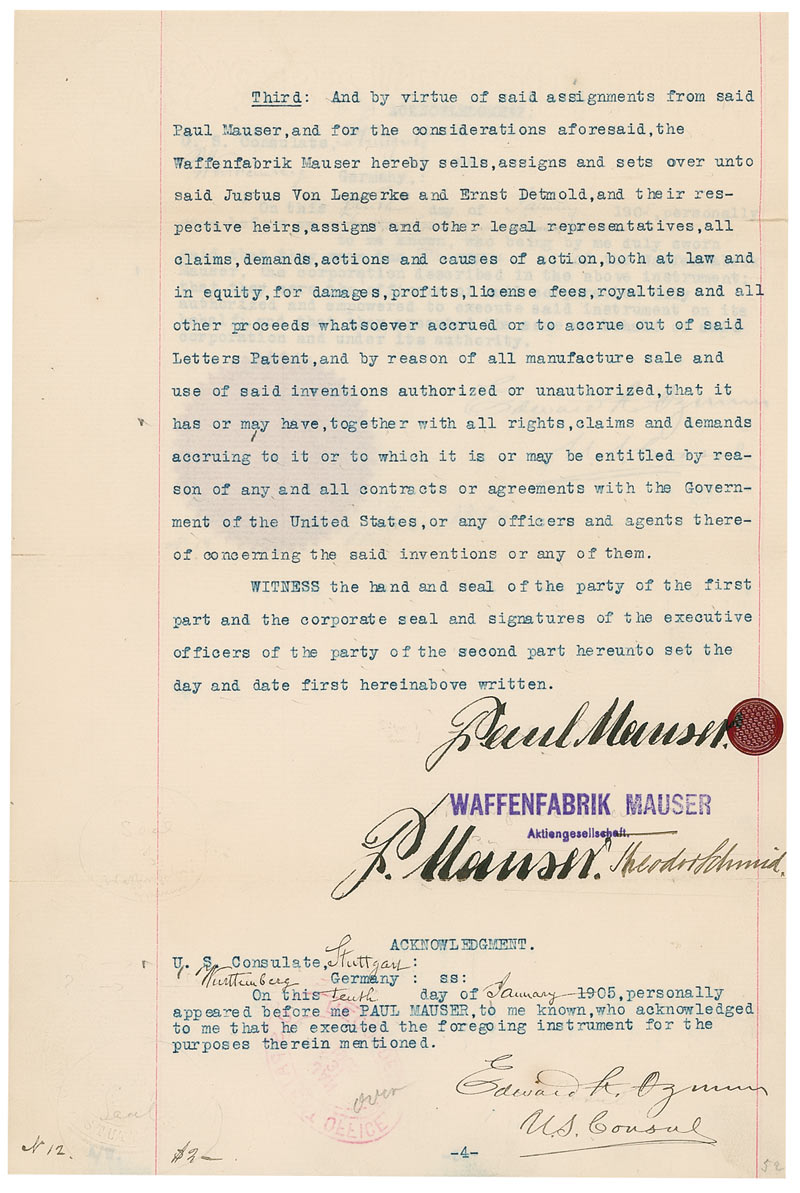 German weapon designer and manufacturer (1838–1914). DS, five pages, 8.25 x 13, January 10, 1905. Indenture agreement between Mauser and his company Waffenfabrik Mauser, and Justus Von Lengerke and Ernst Detmold, assigning 16 patents for his firearms including “Lock Mechanism for Guns,” “Shell–Extractor for Bolt Guns,” and “Fixed magazine for Breech–Loading Bolt Guns,” to Lengerke and Detmold, in exchange for one dollar. Signed twice on the fourth page by Mauser, once as “Paul Mauser,” and again as “P. Mauser.” A receipt from the Commissioner of patents is at the front of the document, which retains its red seal and blue ribbon. In very good condition, with expected folds, some small notations and stamps, punch hole to top left, and uniform light toning.