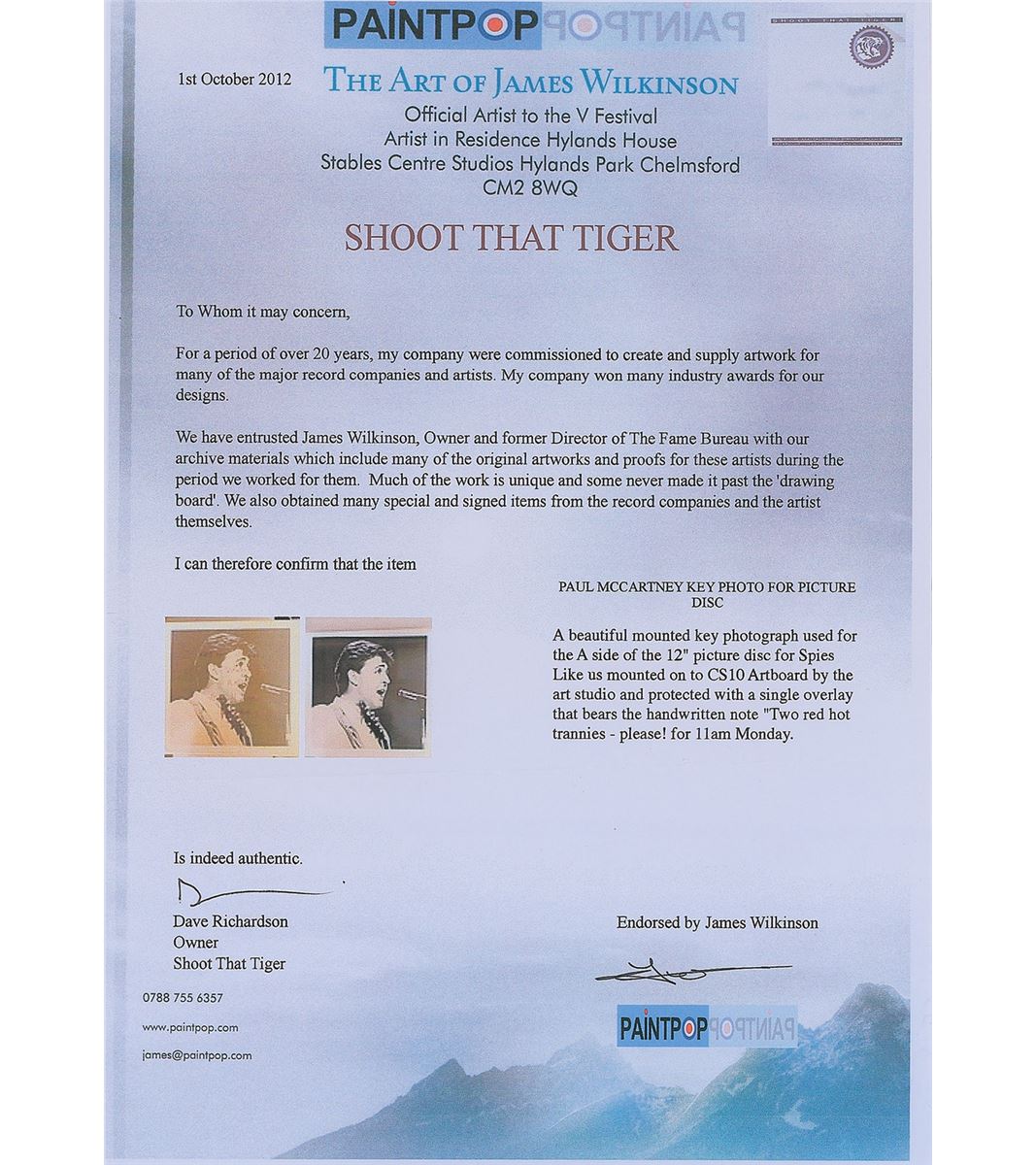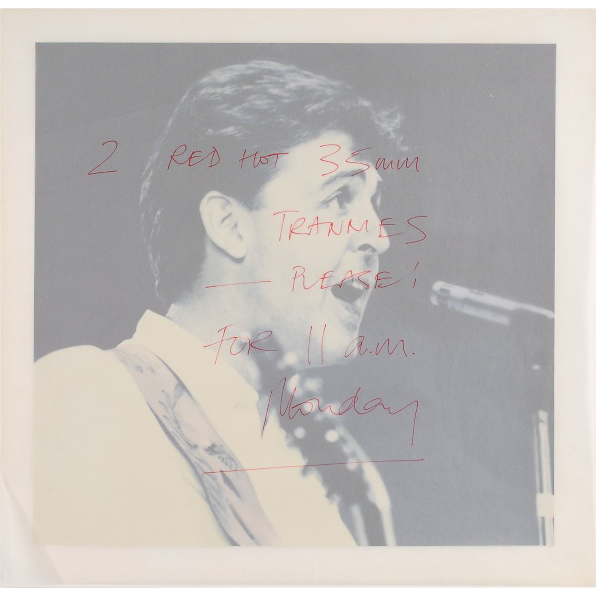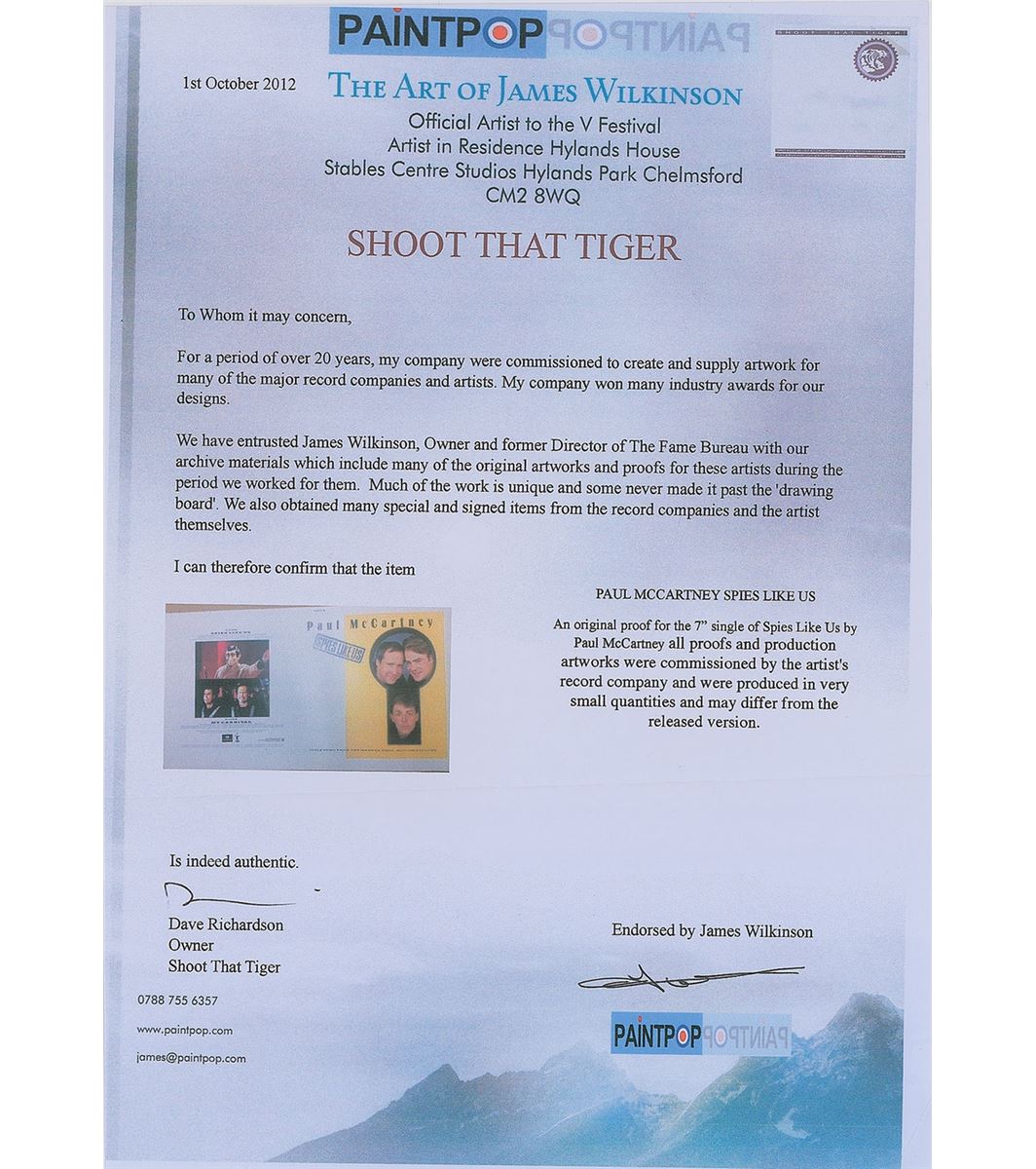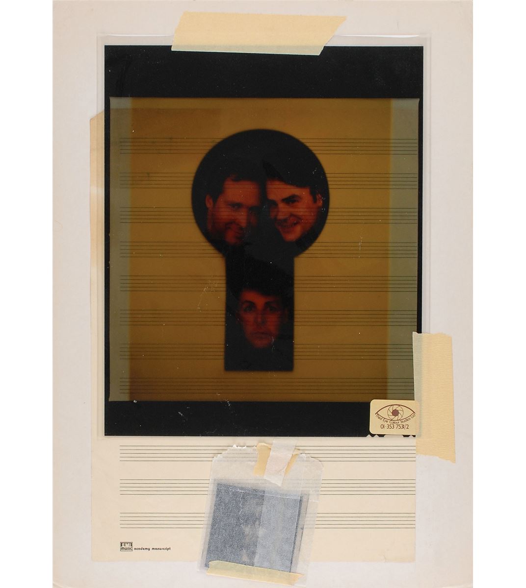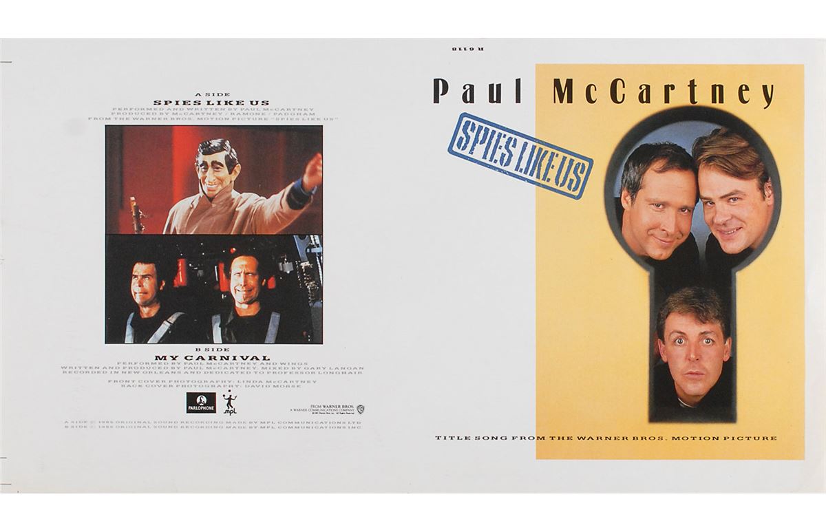 Nice assemblage of production materials for the cover art of the 1985 single Spies Like Us, including: a semi-glossy 13 x 12.25 key photograph of McCartney singing affixed to a 15 x 14.5 mount, used for the A-side of the Spies Like Us 12? picture disc (a tracing-type paper is attached at top, on which McCartney himself has written in red felt tip, "2 Red Hot 35 mm Trannies—Please! For 11 a.m. Monday”; a color 8 x 10 positive key transparency of the keyhole image with McCartney, Chevy Chase, and Dan Aykroyd peeking through; a 2.25 x 2.25 key negative of the keyhole image; and a color 15 x 8.25 cover proof for the 7? single record sleeve. In overall fine condition.