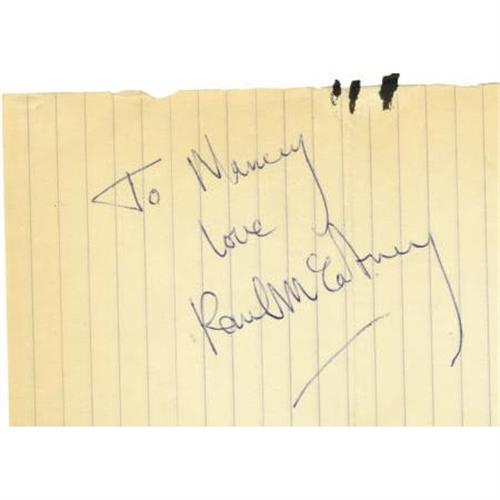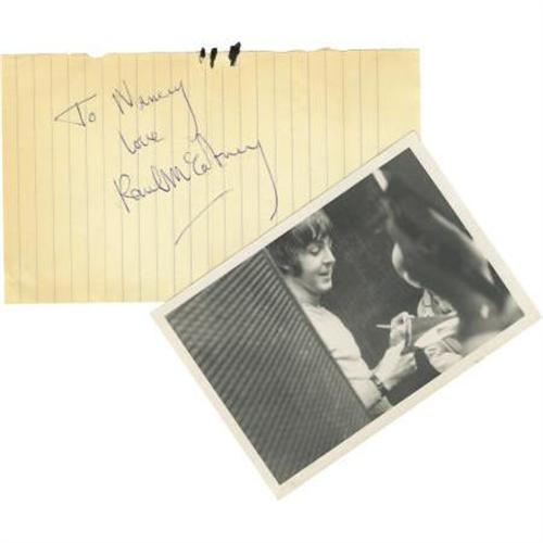 <B>Paul McCartney Photo and Autograph.</B></I> A slip of notepad paper inscribed and signed by McCartney, plus a b&w snapshot of the signing. In overall Very Fine condition with a fold crease, some tear along one edge, and mild wear and tanning.<I>Accompanied by LOA from PSA/DNA.</B></I> <I>Accompanied by LOA from PSA/DNA.</B></I><BR><BR><b>Shipping:</b> Flat Material, Small (<a target="_blank" href="http://www.heritageauctions.com/common/shipping.php">view shipping information</a>)