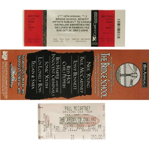 <B>Paul McCartney Concert Poster, Program, and Ticket Group (1990-2004).</B></I> For the past 45 years, Paul McCartney has flown the flag of good old '60s Rock and Roll, whether as a member of the Beatles, Wings, or solo. The poster offered here is for his first tour after formally dissolving Wings. It is by artist David Singer and is for the 3/31/90 show at the University of California, Berkeley. Also included in this lot is a program from the same show. In addition, we have a ticket stub from the first show in the "Driving USA" tour; it has a face value of $250. To top off the lot, a handbill and full ticket from Neil Young's 2004 "Bridge School Benefit" show. At this show, Sir Paul joined Tony Bennet and Neil Young onstage! The poster measures 20.5" x 29" and has a few small dings along the right corners, otherwise condition is Excellent.