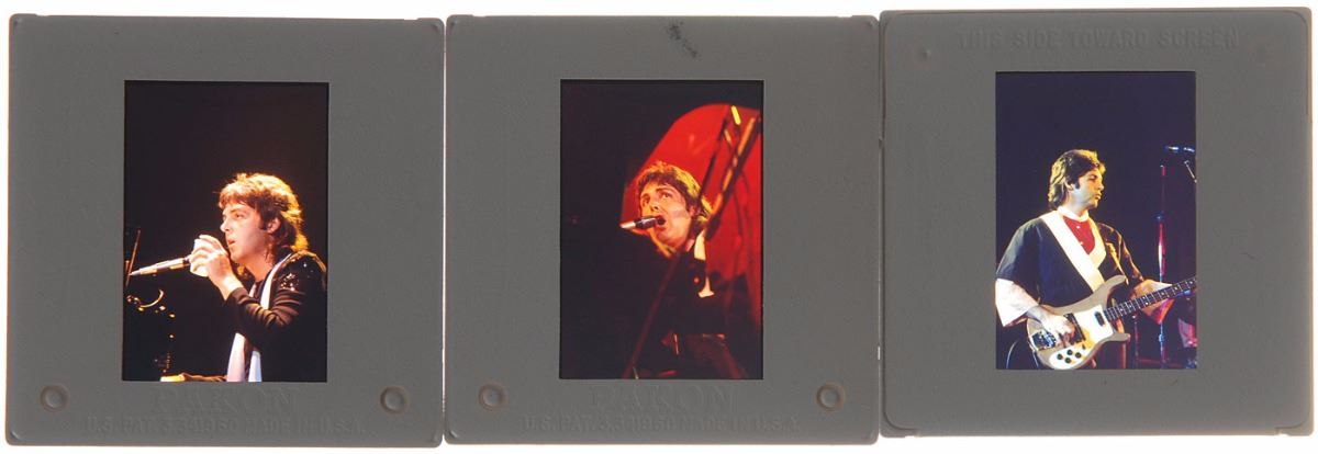Three color 35mm slides by Richard Creamer, each showing Paul McCartney during a post-Beatles performance. In fine condition. Provenance: Richard Creamer Estate.