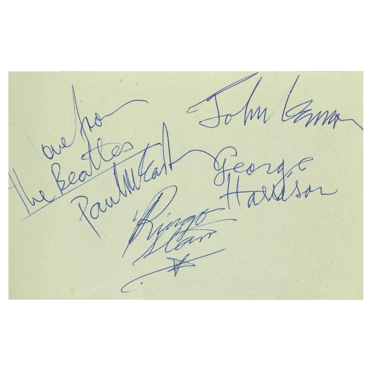 Paul McCartney signature from an autograph book, likely signed sometime during the 1960's. McCartney signs in blue ink: ''Love from the Beatles / Paul McCartney''. He also signs on behalf of his bandmates: ''John Lennon'', ''George Harrison'' and ''Ringo Starr''. Page contains another signature on verso. 5.75'' x 4.25'' book shows wear at edges and backstrip. Signature page itself is very clean, only one small mark not affecting signatures, which are clear and bold. Very good.