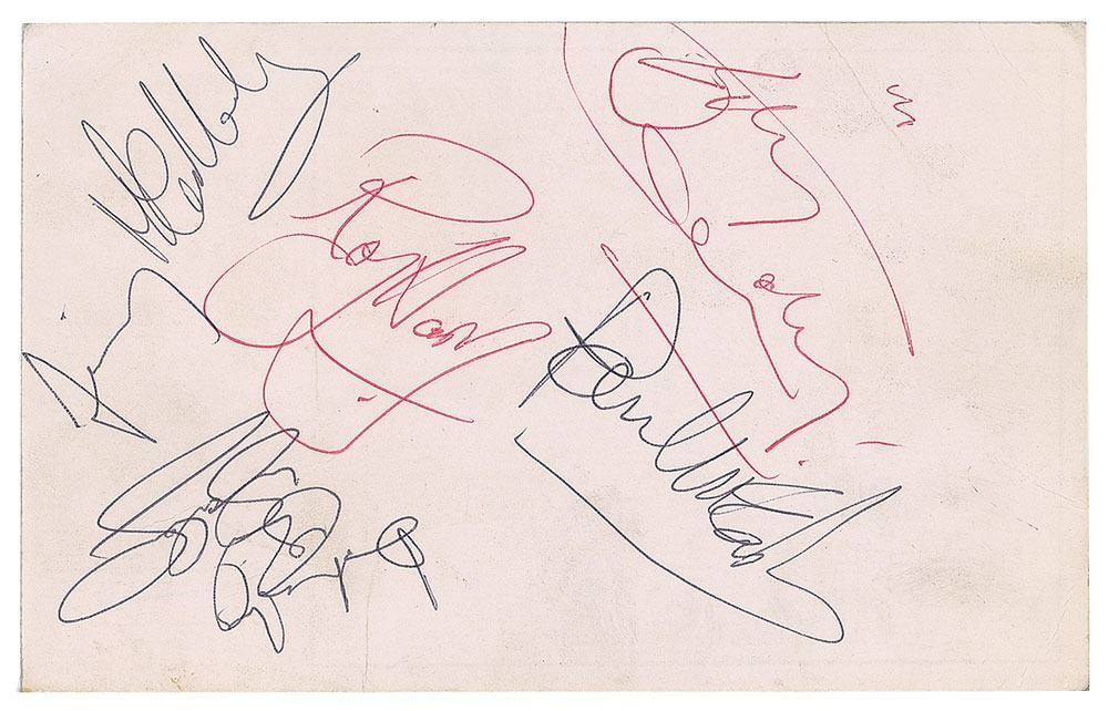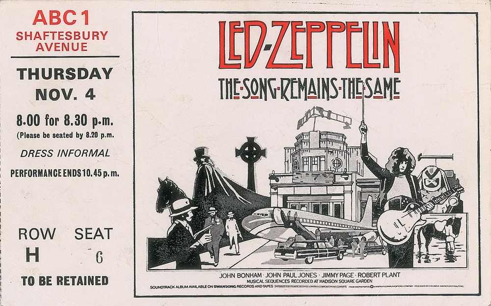Original premiere ticket for the Led Zeppelin concert film ‘The Song Remains the Same,’ 6.75 x 4.25, held at the ABC Shaftesbury Avenue on the November 4, 1976, signed on the reverse in black ballpoint by Paul McCartney. The reverse also bears signatures from Wings musicians Jimmy McCulloch, Billy Connolly, Roy Wood, and one other. Includes the original counterfoil, which is issued as "Row H, Seat 6." In fine condition, with light handling wear. Accompanied by a certificate of authenticity from Tracks, and by a letter of provenance from the original recipient.