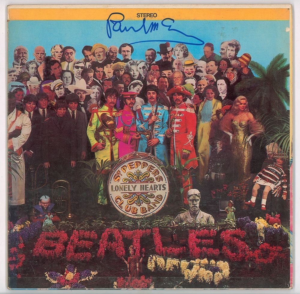Sgt. Pepper's Lonely Hearts Club Band album by the Beatles, signed on the front cover in blue felt tip by Paul McCartney. In fine condition, with a small area of old price sticker residue, and a tiny surface tear to the upper right edge. The record is included. Accompanied by a John Brennan Collection letter of provenance.