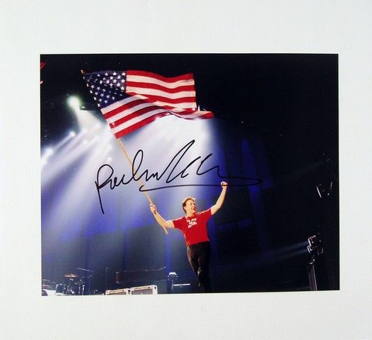 A great color photo of Paul McCartney in concert waving a giant American Flag and personally autographed by him. Comes with a Certificate of Authenticity from Starstruck. (Color photo 8"x10").