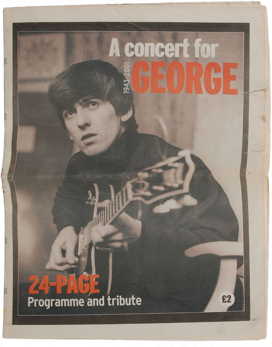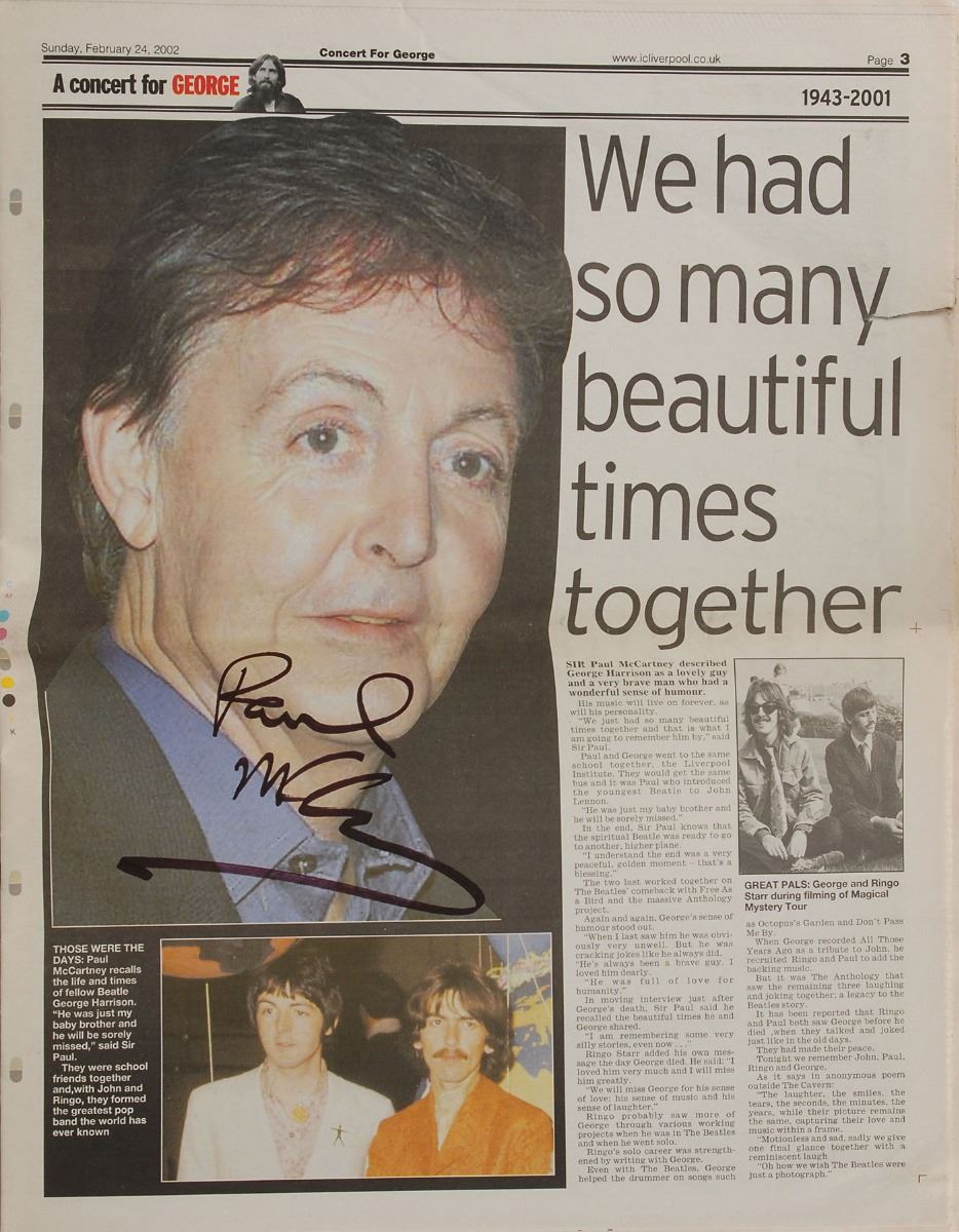 Special edition Liverpool ECHO newspaper program and tribute for A Concert for George, twenty-four pages, 11.75 x 15.5, dated February 24, 2002, boldly signed on the third page in black felt tip by Paul McCartney. In very good to fine condition, with some overall wear and a tear to upper right edge. As a memorial to George Harrison on the first anniversary of his death, the Concert for George was held at London’s Royal Albert Hall November 29, 2002, with all profits from the event going to the Material World Charitable Foundation.