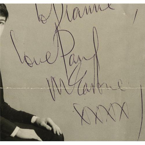 <B>Paul McCartney Signed Photo.</B></I> A b&w 6.5" x 8.5" photo of a young McCartney, inscribed "To Dianne Love Paul McCartney XXXX," with "Hello Dianne!!!" added in a word balloon, and signed by the Beatle in black ink. In Fine condition with a heavy horizontal fold crease and moderate wear and soiling around the edges. <I>Accompanied by LOA from PSA/DNA.</B></I> <BR><BR><B>Important notice