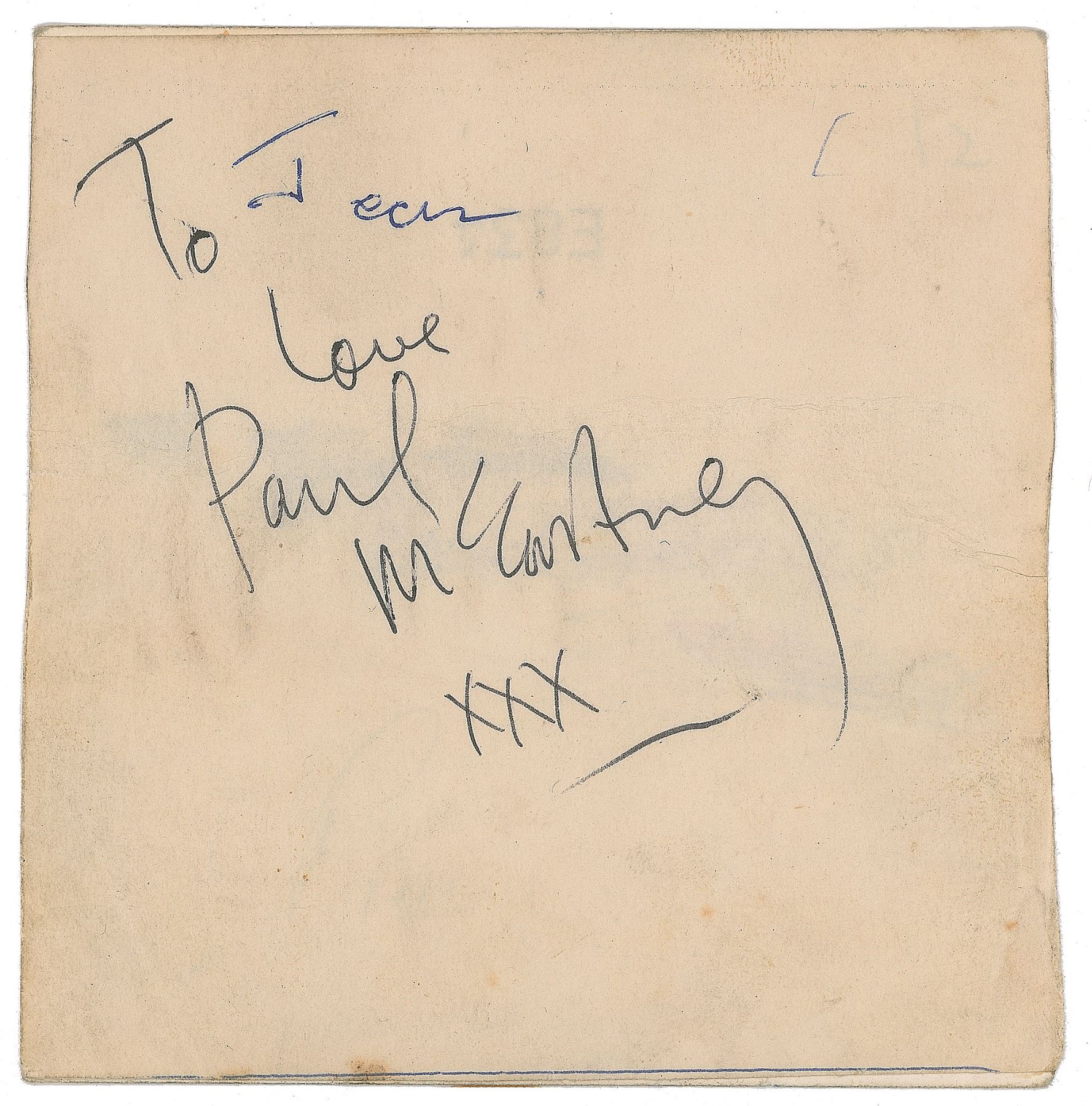 Extremely rare vintage photo of Paul McCartney performing with the Beatles at the Cavern Club in Liverpool on April 5, 1962, signed on the reverse in black ballpoint, “To…Love, Paul McCartney, xxx,” with the original owner adding her name “Jean” as the inscription. On this date the Beatles played a special concert that was organized by The Beatles Fan Club, which was dubbed ‘the Beatles for their fans.’ The group played the first half of the show in their black leather outfits and then changed into their new Beno Dorn suits and ties for the latter half. In very good condition, with creasing to the photo side, and light soiling and horizontal wrinkling to the signature. Accompanied by a certificate of authenticity from Tracks.