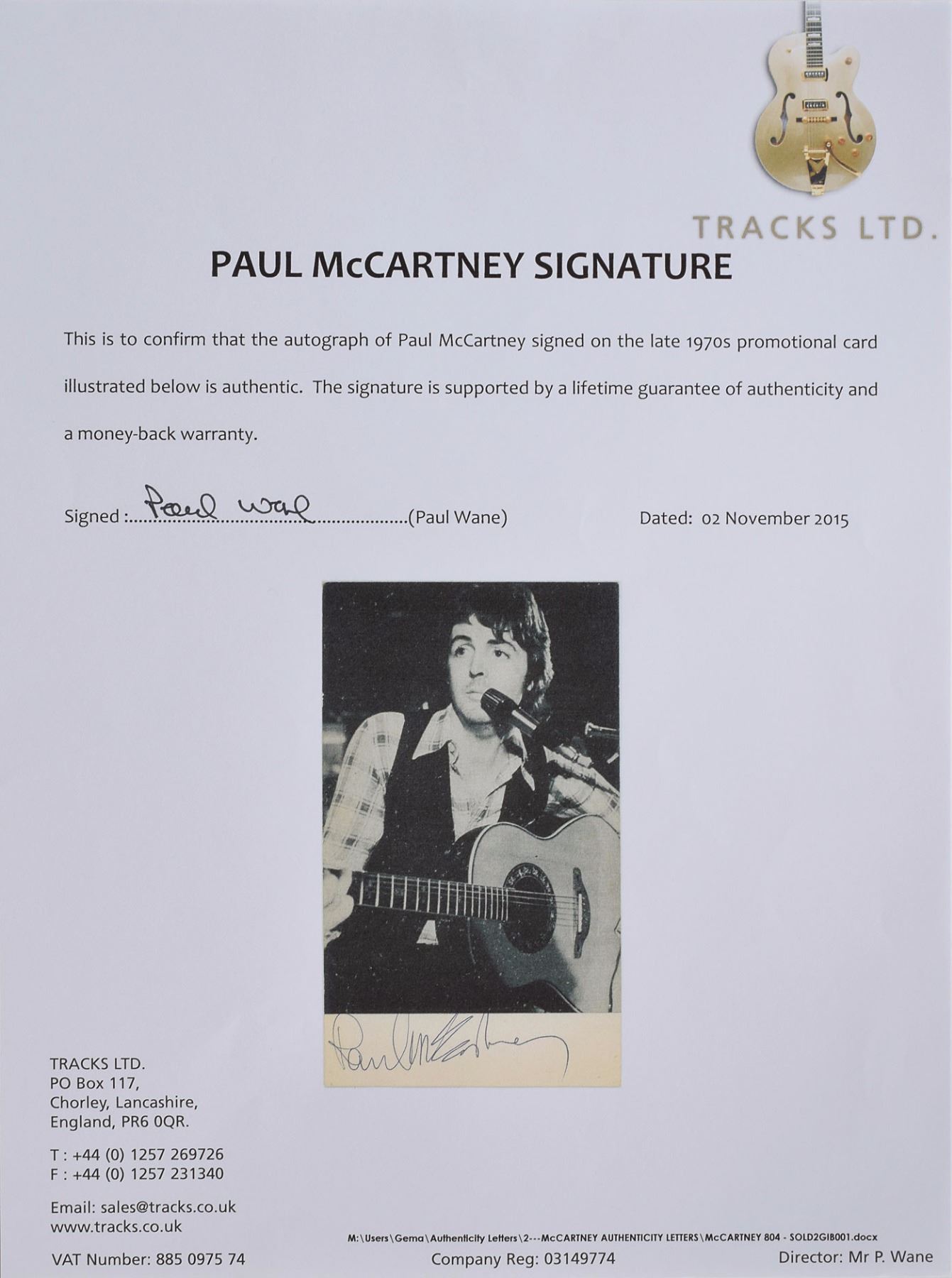 Vintage circa late 1970s promo card showing McCartney playing his acoustic guitar, 3.5 x 5.75, signed at the bottom in blue ballpoint, "Paul McCartney." Housed in a screw-down acrylic case. In fine condition. Accompanied by a certificate of authenticity from Tracks.