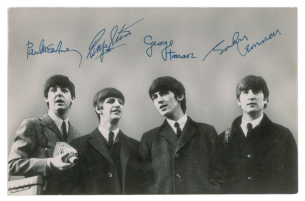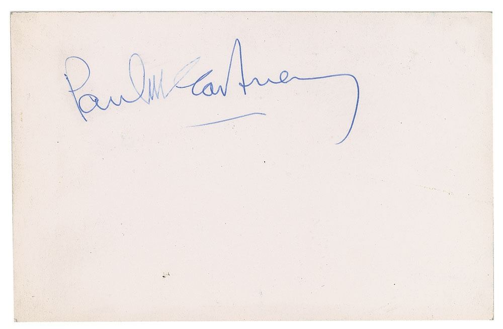 Desirable vintage glossy 5.5 x 3.5 promo card for the Beatles' 1964 tour of the United States, signed on the reverse in blue ballpoint, "Paul McCartney." The front features a portrait of the four Beatles bandmates with facsimile signatures above. In fine condition.