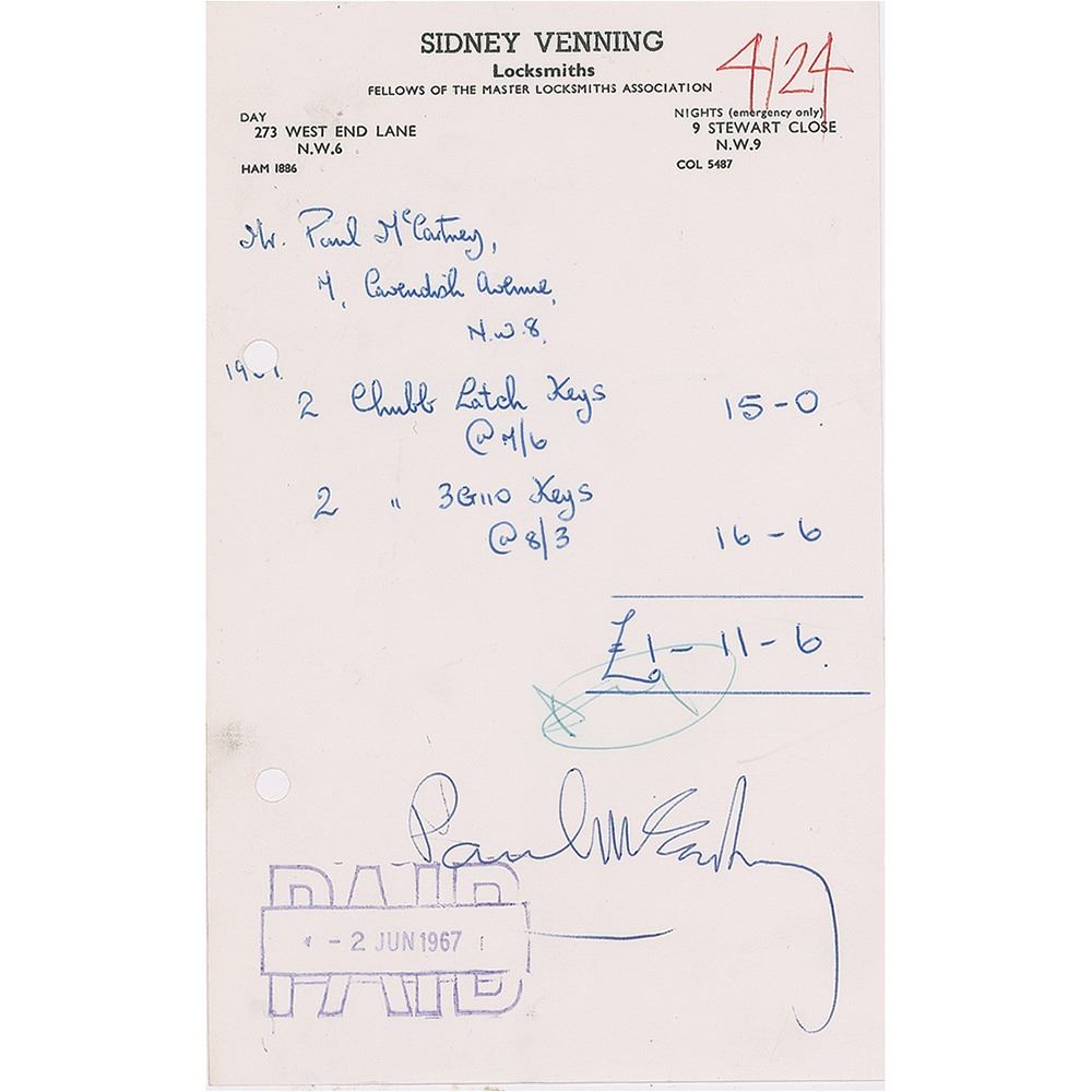Manuscript DS, one page, 5 x 8, stamp-dated June 2, 1967. Receipt from locksmiths Sidney Venning for "2 Chubb Latch Keys" and "2 Chubb 3G110 Keys," signed below in ballpoint by Paul McCartney. In fine condition, with two file holes to the left edge.
