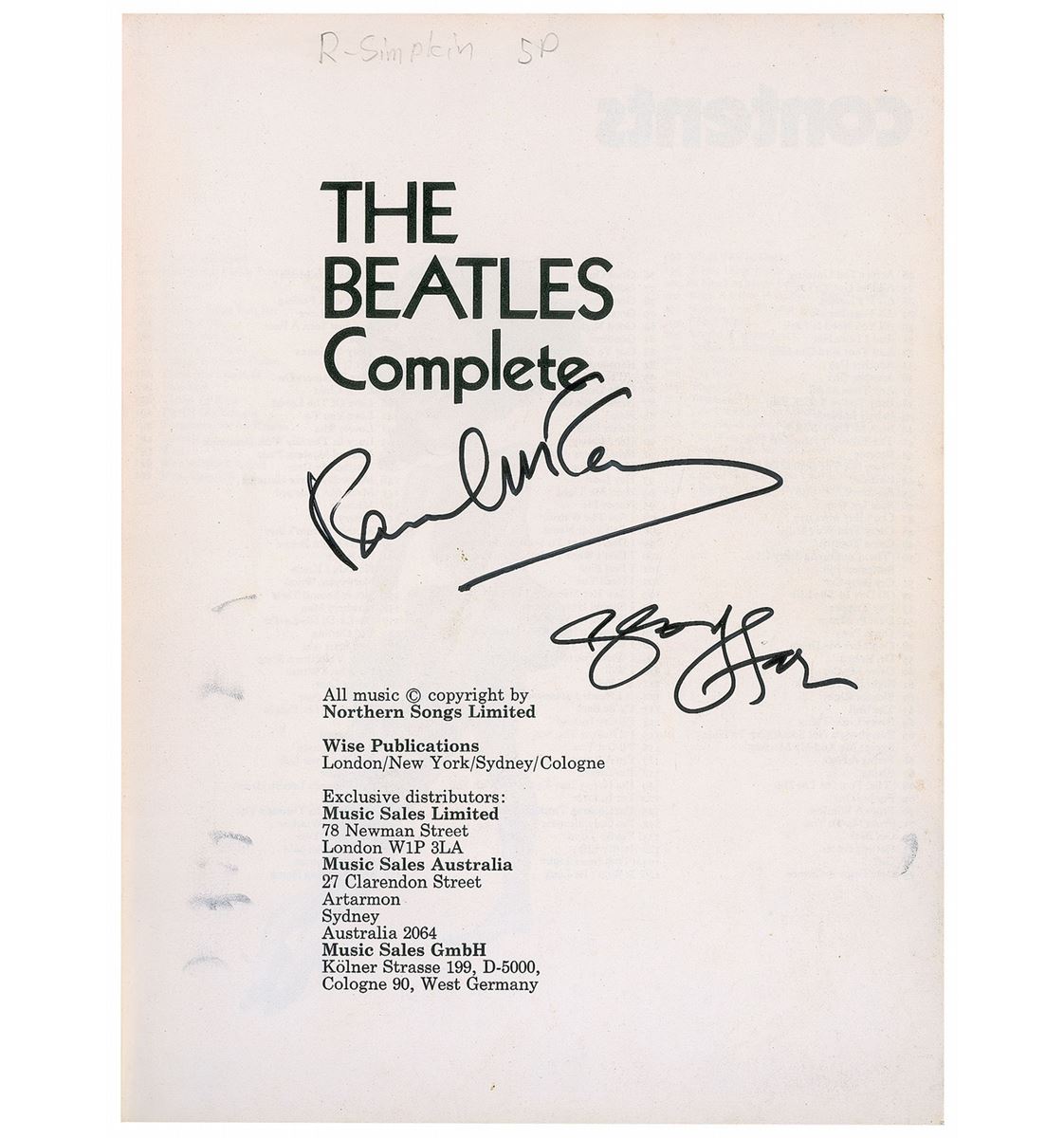 Signed book: The Beatles Complete. London: Wise Publications, 1971. Softcover, 8.5 x 11, 218 pages. Signed on the title page in black felt tip by Paul McCartney and George Harrison. Some scattered ink smudges to borders of signed page, and moderate wear to covers, otherwise fine condition. Originally obtained by in-person collector Richard Simpkin, who includes a letter of provenance, and mentioned in his book, Richard & Famous, on pages 55 and 67. This book was signed by McCartney when he toured Australia in 1993, and by Harrison when he visited Adelaide for the Grand Prix in 1995. The Richard Simpkin Collection.