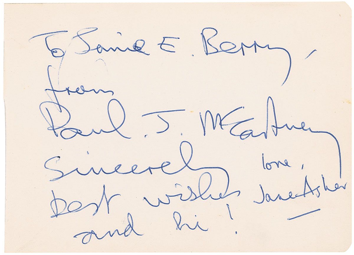 Vintage ballpoint signature and inscription “To Janice E. Berry from Paul J. McCartney, sincerely best wishes and hi!,” and also signed in blue ballpoint, “love, Jane Asher,” on an off-white 5 x 3.5 album page. In fine condition, with a couple minor creases. Accompanied by a certificate of authenticity from Tracks and a 2012 letter of provenance from the original recipient which reads, in part: “This is a genuine autograph of Paul McCartney and his then girlfriend Jane Asher…I’m not too sure of the date it was obtained but I think around 1966/1967. My mother worked for a catalogue company and one of her customers was Paul’s cousin…Paul visited this cousin quite often and was sometimes seen strolling along the promenade which was just down the road from his cousin’s. My mother arranged for mine and my brother’s autograph books to be left at the house. Paul and Jane were due to make a visit and they kindly signed the books personally addressing the autographs to me.” Asher and McCartney were a couple for five years after meeting at the Royal Albert Hall in 1963. A very scarce example of McCartney’s seldom-seen more formal signature.