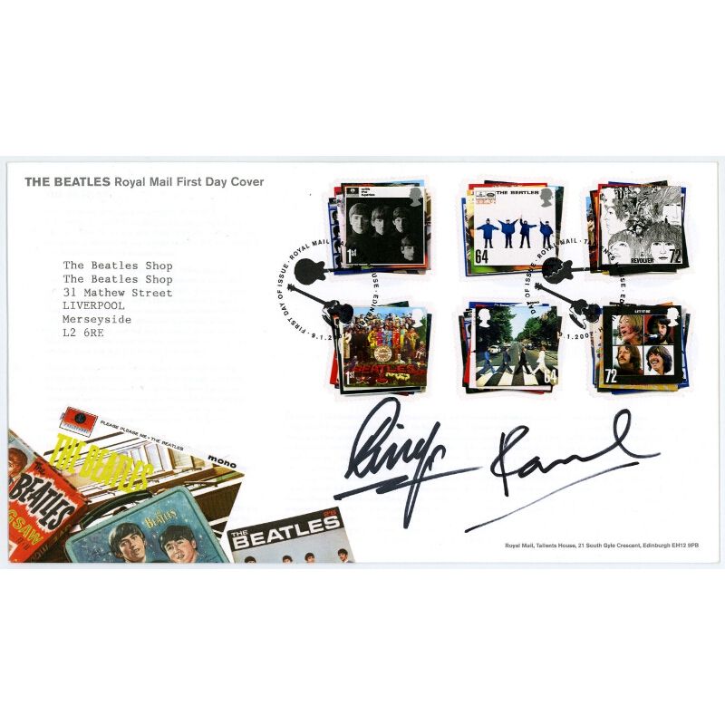 A set of official Royal Mail Beatles first day cover postage stamps that have been signed by Paul McCartney and Ringo Starr in black felt tipped pen first name only.