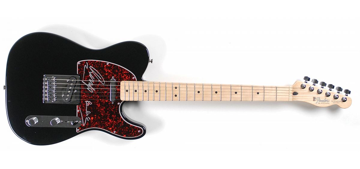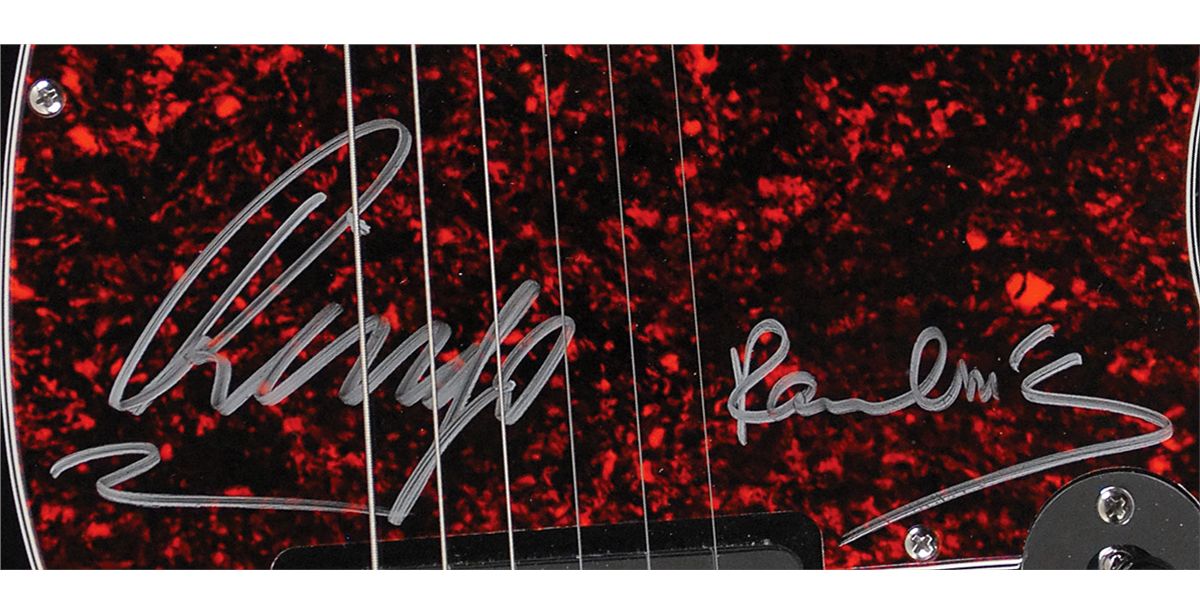 Black-bodied Fender Telecaster electric guitar, serial number MZ8124800, signed on the tortoiseshell pickguard in silver ink, “Paul McCartney” and “Ringo.” In very fine condition. Accompanied by a Road Runner hardshell case. Consignor notes that the Starr signature was acquired on June 29, 2008, in San Diego, and McCartney signed on November 11, 2012, in St. Louis. A beautiful piece perfect for vertical display, signed by two Beatles rarely seen in combination.