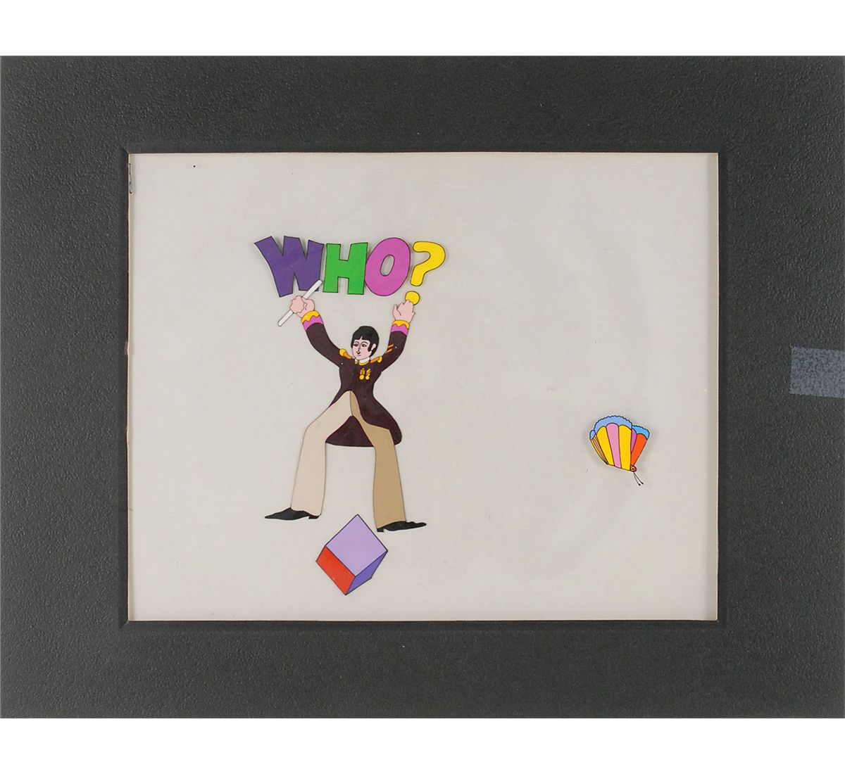 (United Artists/King Features, 1968) Original production cel featuring Paul McCartney from Yellow Submarine. Image measures 3 x 5, and shows McCartney holding a baton, with “Who?” above his head in colorful letters, with small images of a cube and butterfly also present, with a mat opening of 9.5 x 7. Mat dimensions are 13.75 x 10.75. In fine condition, with a small piece of tape to right edge of mat.