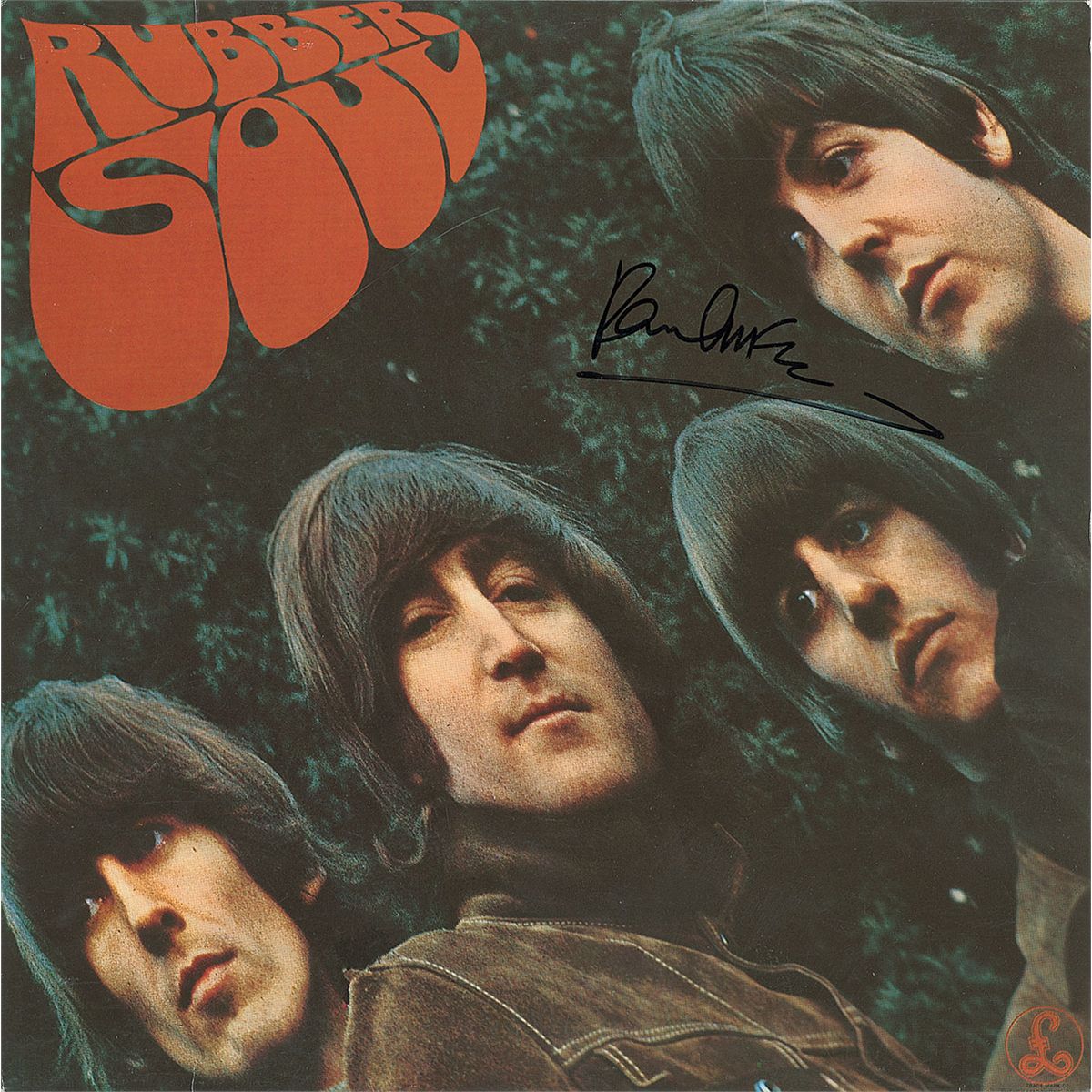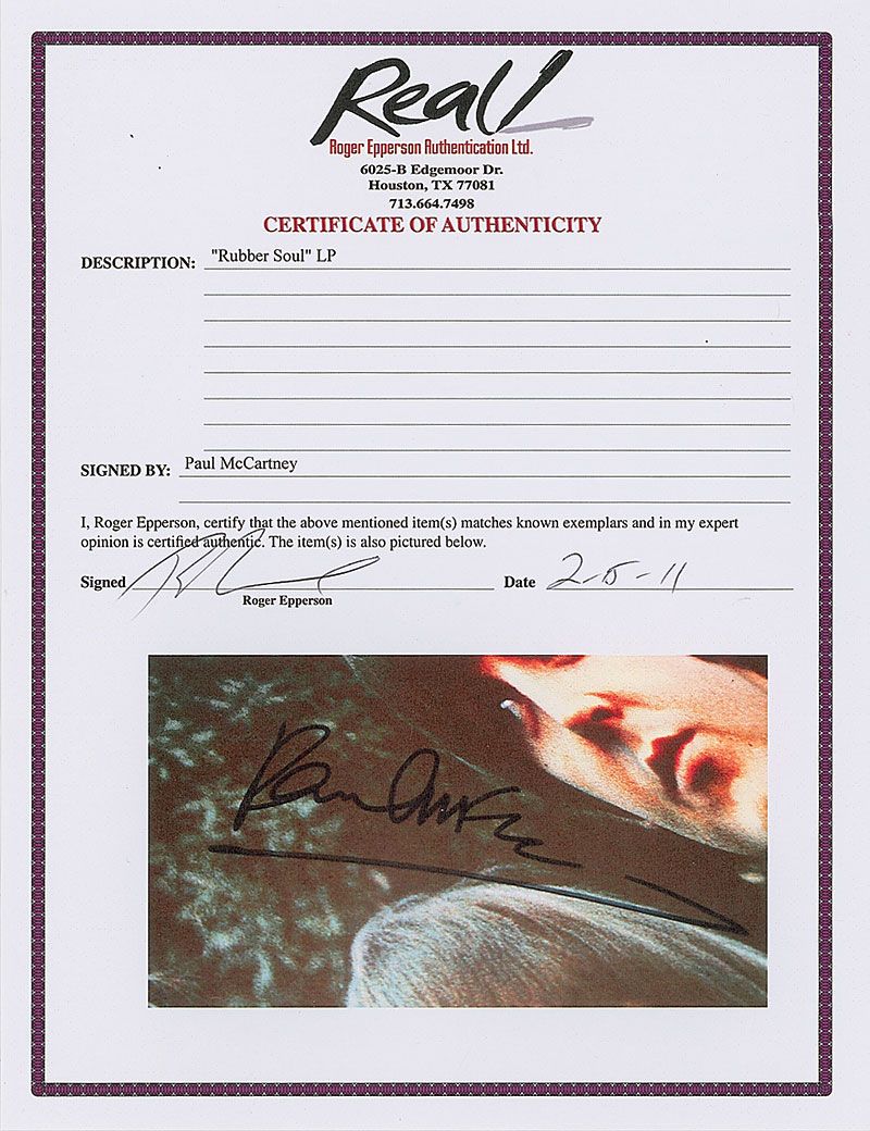 Rubber Soul album signed on the front cover in black felt tip. In fine condition, with a couple trivial creases and a surface impression along the left edge. The record is included. Consignor notes that this was acquired in person on August 19, 2009, at DFW International Airport after McCartney’s concert at Cowboys Stadium. Accompanied by a certificate of authenticity from Roger Epperson/REAL.