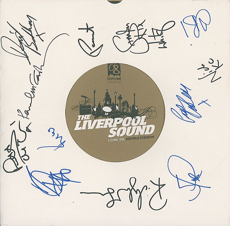 Program from the Liverpool Sound concert, 11.75 x 11.75, held at Anfield Stadium on June 1, 2008. Signed in black felt tip on the out sleeve, which resembles an album sleeve, by McCartney. Sleeve is also signed by Paddy McGuiness, The Kaiser Chiefs, and The Zutons. In very good condition, with scattered creases to sleeve, a couple through McCartney’s signature, and a partial separation to one edge of sleeve. Accompanied by a certificate of authenticity from Tracks.