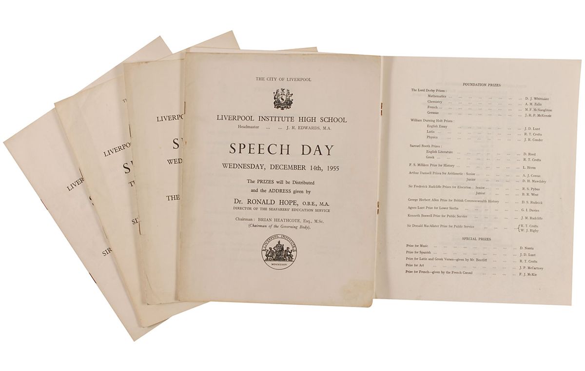 Collection of five Liverpool Institute Speech Day programs from the time Paul McCartney was at the school, each measuring 8 x 10. The programs are from December 1955, December 1956, December 1957, December 1958, and December 1959. In December 1959, McCartney was awarded a special prize for art and he is listed in the program. A few loose pages, pencil notations to the program with McCartney’s listing, and scattered toning and soiling, otherwise very good condition. Accompanied by a certificate of authenticity from Tracks.
