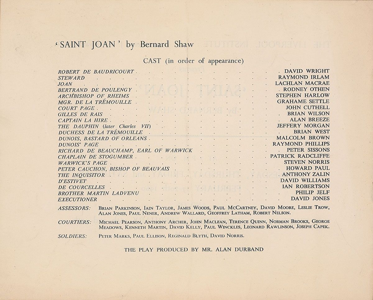 Scarce program for the Liverpool Institute production of Saint Joan by George Bernard Shaw, February 16–20, 1960, 9 x 7.25, naming McCartney inside as one of the actors playing an assessor. In fine condition, with mild creases. McCartney was a student at the Liverpool Institute, which was where he met George Harrison in 1954. His appearance in Saint Joan is considered to be one of McCartney’s first stage performances.